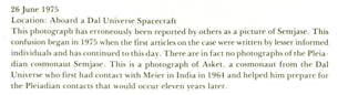 The caption for this photo reads, “This photograph has erroneously been reported by others as a picture of Semjase. This confusion began in 1975 when the first articles on the case were written by lesser informed individuals and has continued to this day. There are in fact no photographs of the Pleiadian cosmonaut Semjase. This is a photograph of Asket, a cosmonaut from the Dal Universe who first had contact with Meier in India in 1964 and helped him prepare for the Pleiadian contacts that would occur eleven years later.”