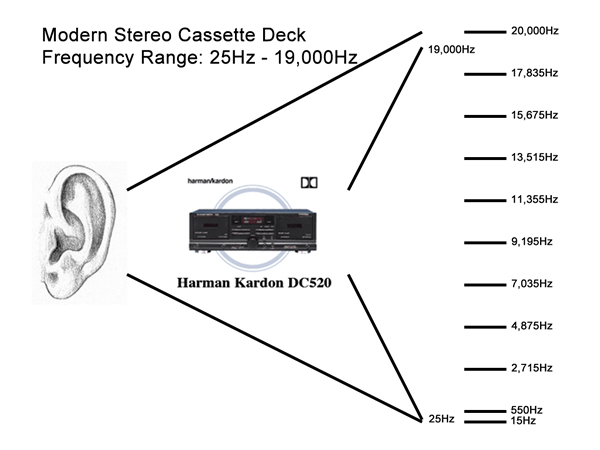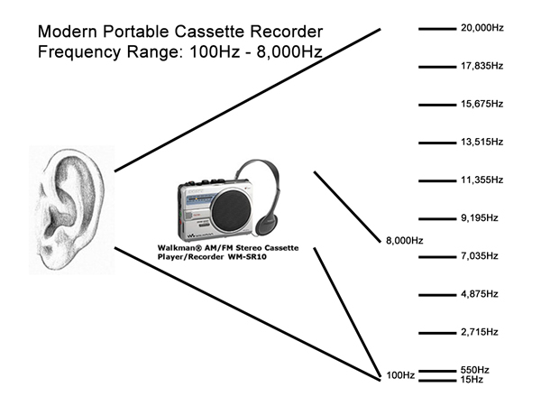 A modern portable audio cassette recorder has a much narrower recording frequency range. It is only 100Hz to 8,000Hz.