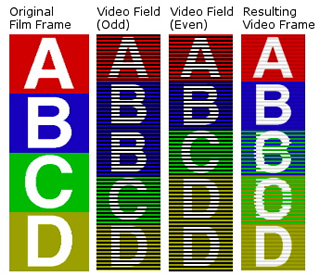 Basically every 4 frames of film needs to become 5 frames of video. This is done by duplicating some film frames onto two different video fields of the same video frame. This causes some video frames to actually contain 2 different film frames. This is called interlacing.
